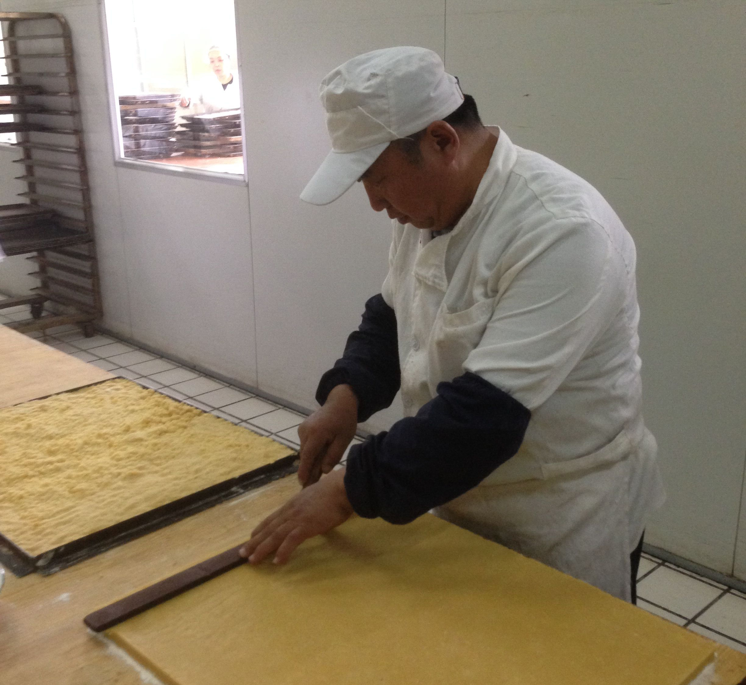 “蘇打餅干整個(gè)制作要花費(fèi)6個(gè)多小時(shí),其中醒面就占了將近4個(gè)多小時(shí)。這是一種清酥面的搟法,面皮和完以后裹上油之后再搟,所以要求面必須醒到位。另外需要注意的就是搟面的手法。搟制的過(guò)程中,面皮擱到桌面上要能清晰地看到面皮上的紋路,而且要均勻。”賈少春說(shuō)起“蘇打餅干”的制作工藝如數(shù)家珍。